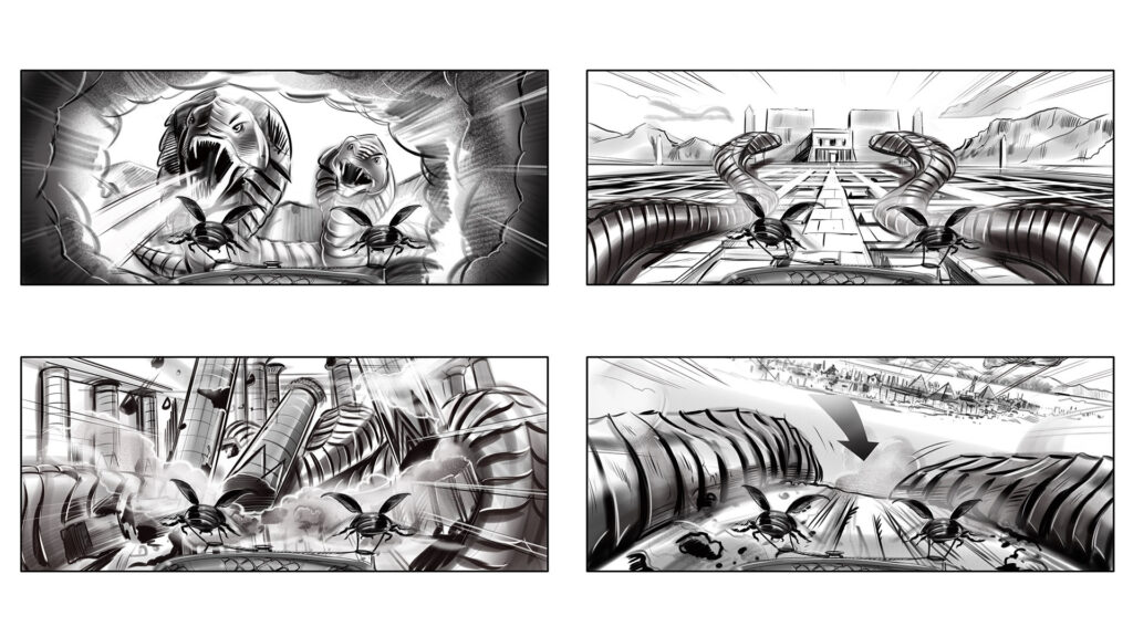 This roller coaster ride takes in the whole movie, including sneaking through the city and night to break into the vault, weaving past giant fire breathing cobras in underground tunnels and blasting the evil god Set into a giant spire that explodes to bring light back to the land… it’s all in there.