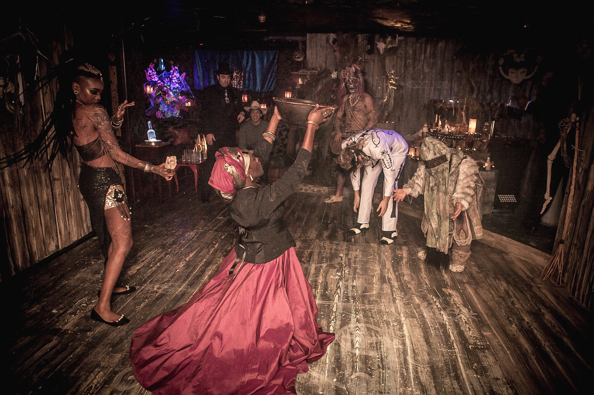 The night had a cast of characters roaming the floor, which were part of an unfolding story. As the night drew on, Marie Laveau (The Voodoo Queen) summoned the Voodoo priest Baron Samedi from his grave. He slowly possessed the night dwellers, and led them all into a voodoo dance frenzy.